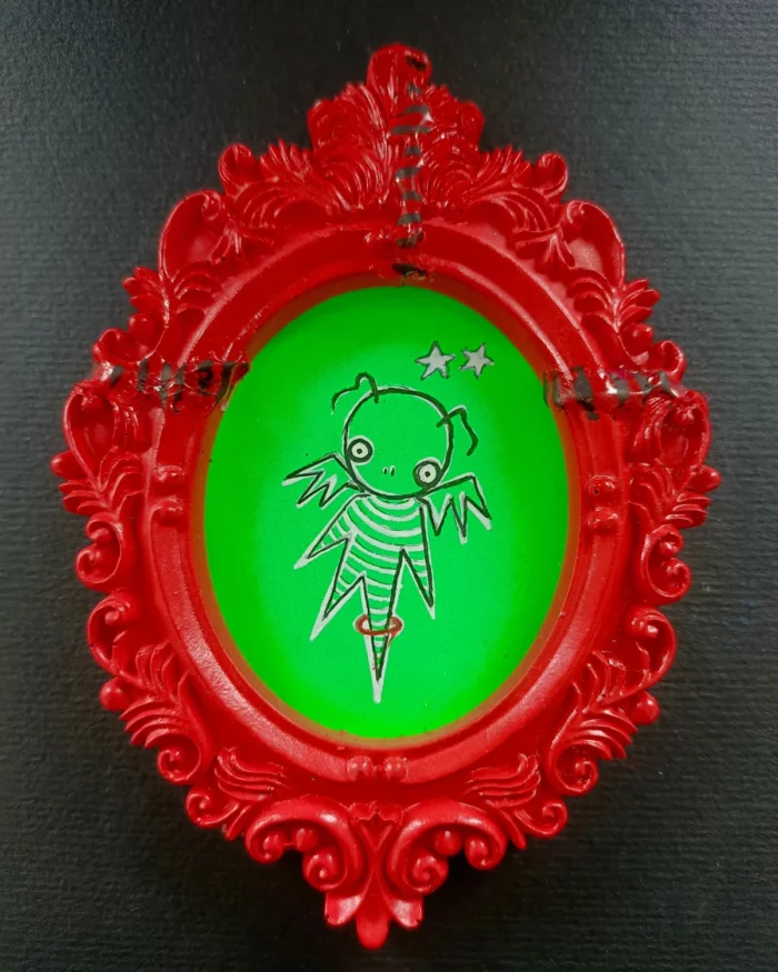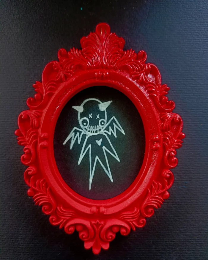 Dans des petits cadres, tous style baroque avec des moulures ornées et des volutes sont représentés des créatures stylisés. Ces figures qui évoquent des personnages « cartoon » avec un air diabolique ou monstrueux.