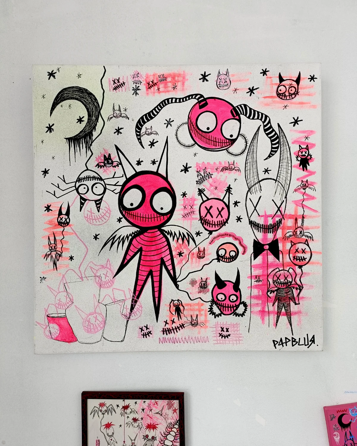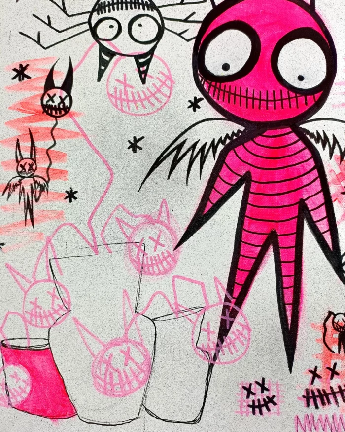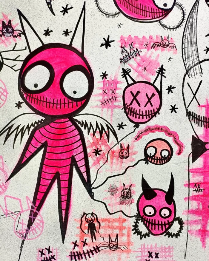 Ce tableau présente un style influencé par la culture emo, avec une palette de couleurs dominée par le rose vif, le noir et le blanc. L’ensemble de l’œuvre a une esthétique enfantine et subversive, typique de l’art qui explore des thèmes liés à l’identité, à l’émotion et à l’aliénation, très présents dans le mouvement emo. Les motifs récurrents incluent des créatures stylisées aux grands yeux expressifs.