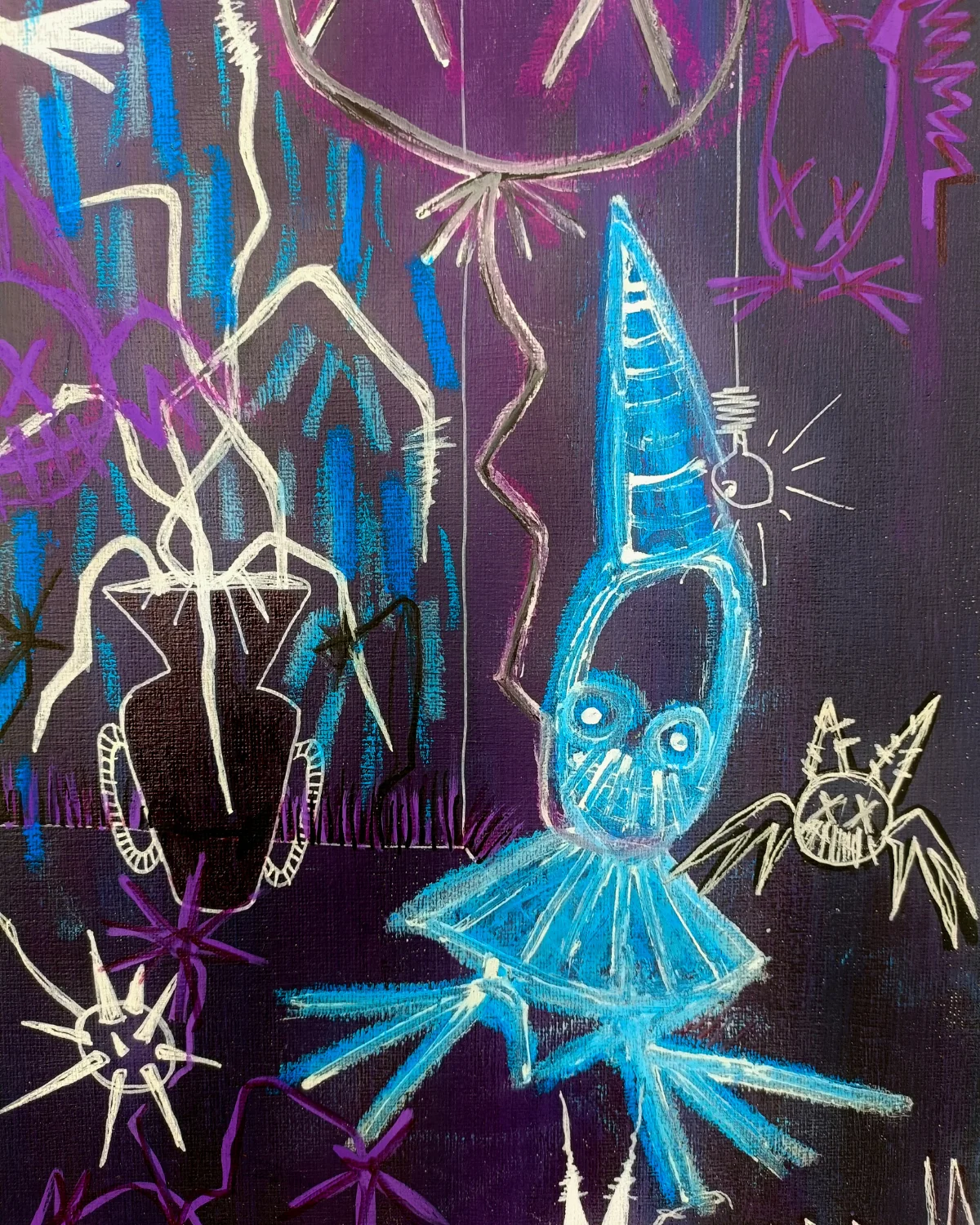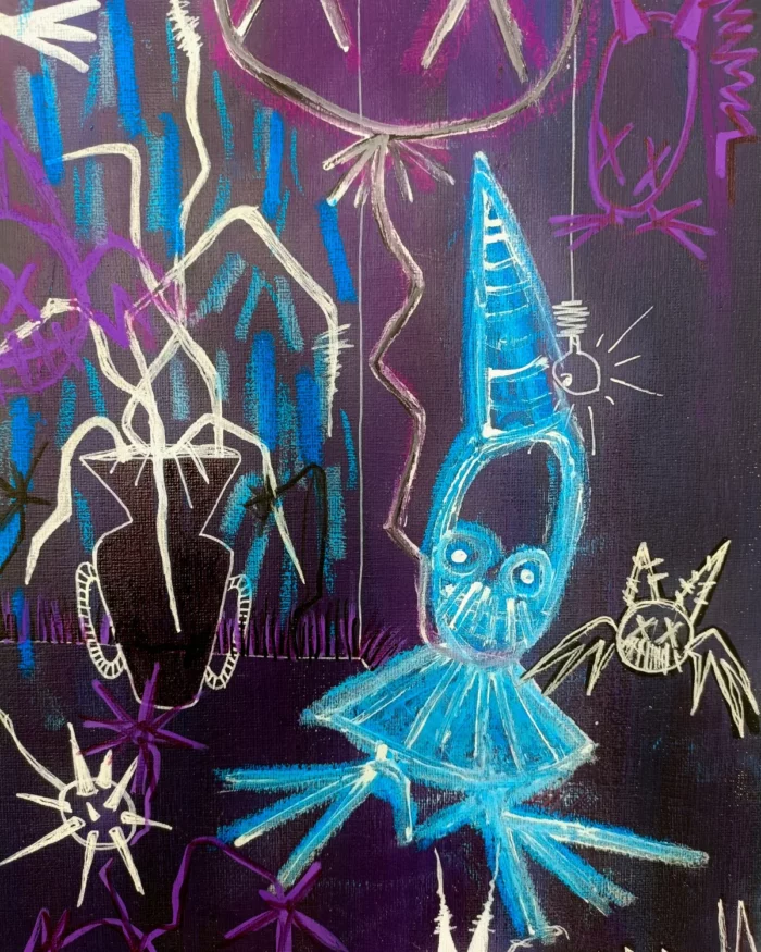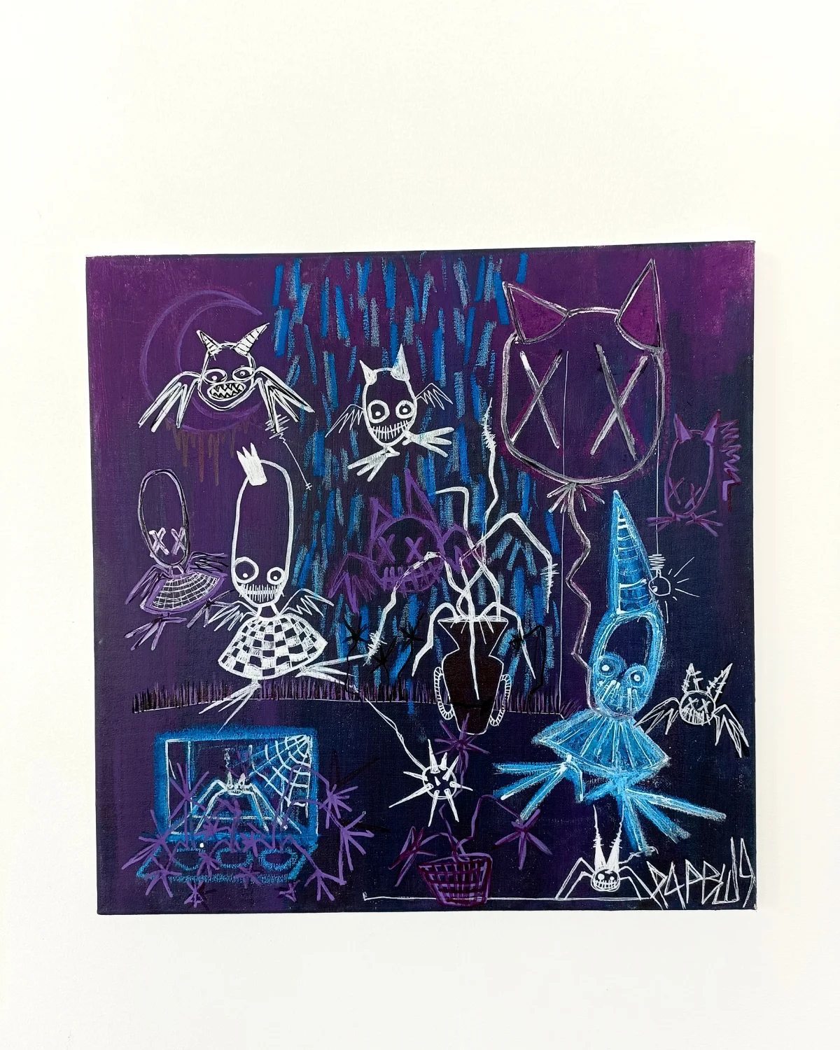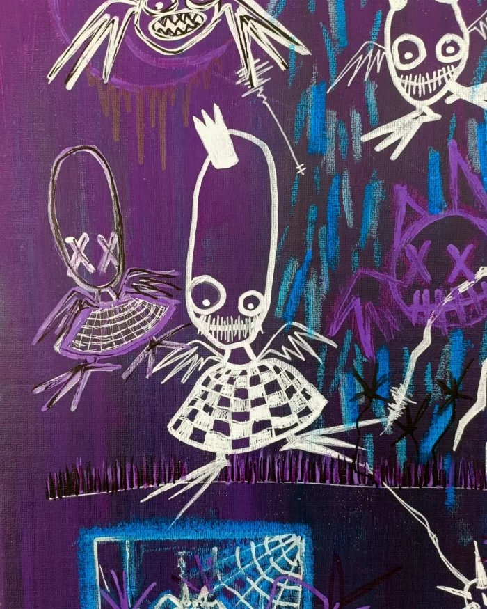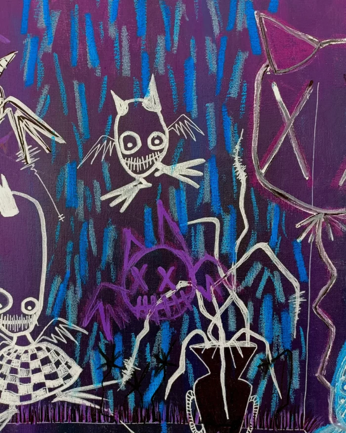 Ce tableau présente une scène sombre, dominée par des teintes de violet profond et de bleu électrique. On y voit des créatures, certaines ressemblant à des chats aux expressions étranges, d’autres à des araignées et des insectes. L’ensemble dégage une atmosphère à la fois enfantine et inquiétante.