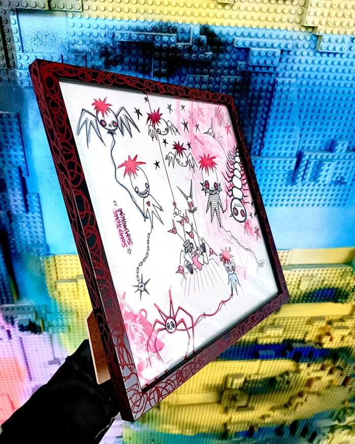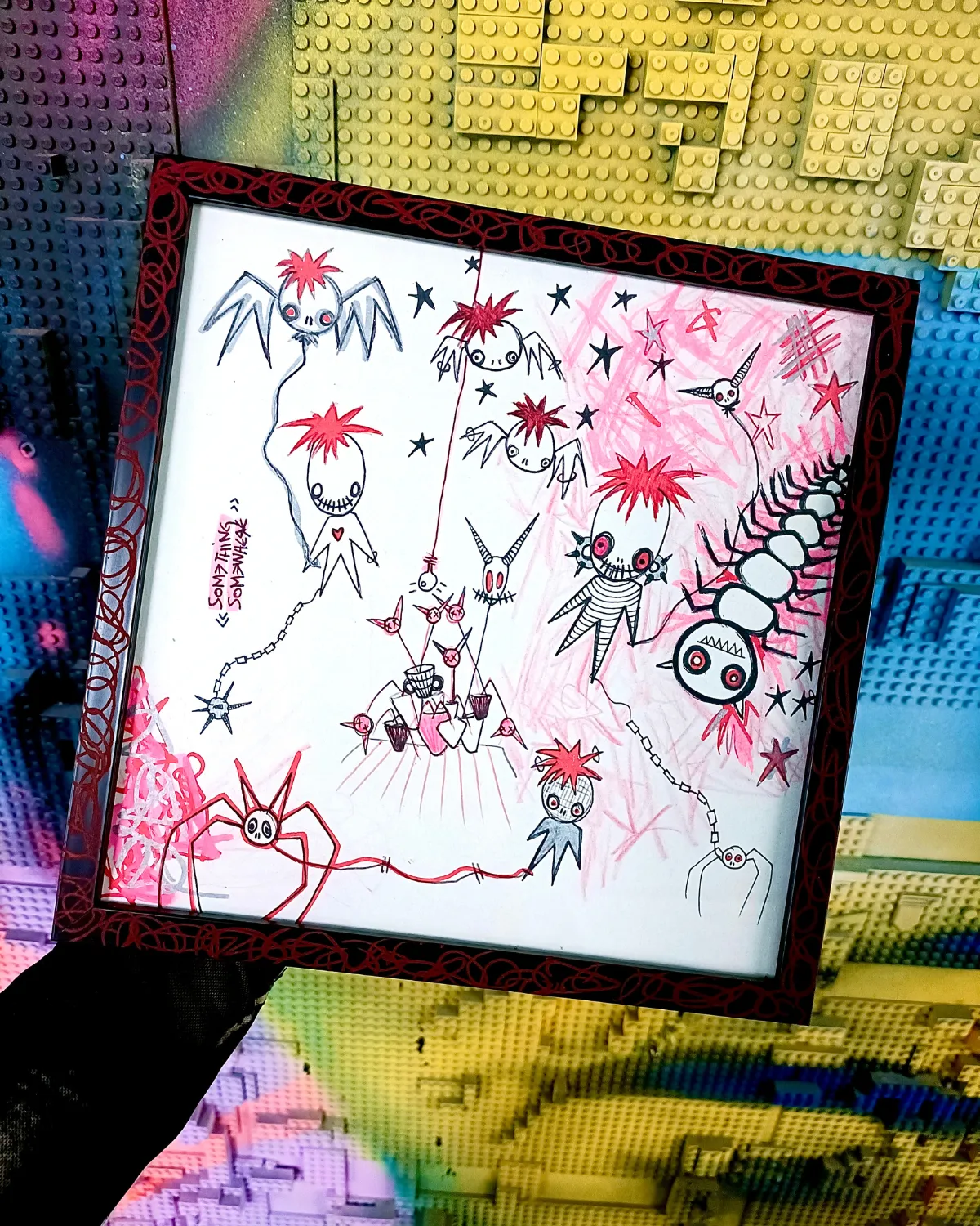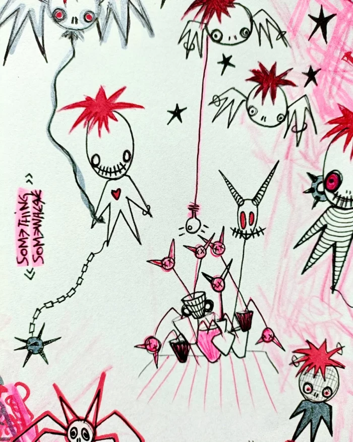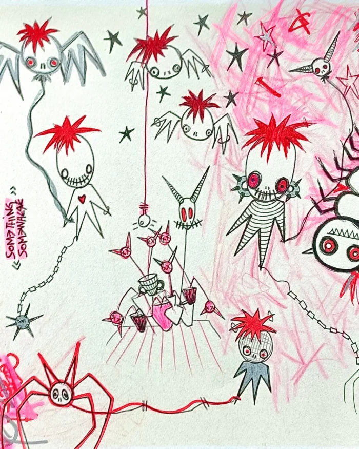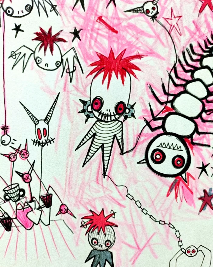 Ce dessin présente plusieurs figures stylisées principalement en noir, blanc et diverses nuances de rose/rouge. De nombreuses figures ressemblent à des créatures squelettiques ou fantomatiques, à des araignées et une créature similaire à un mille-pattes. Le fond est rempli d’étoiles et lignes gribouillis abstraits rose/rouge, créant une atmosphère chaotique.
