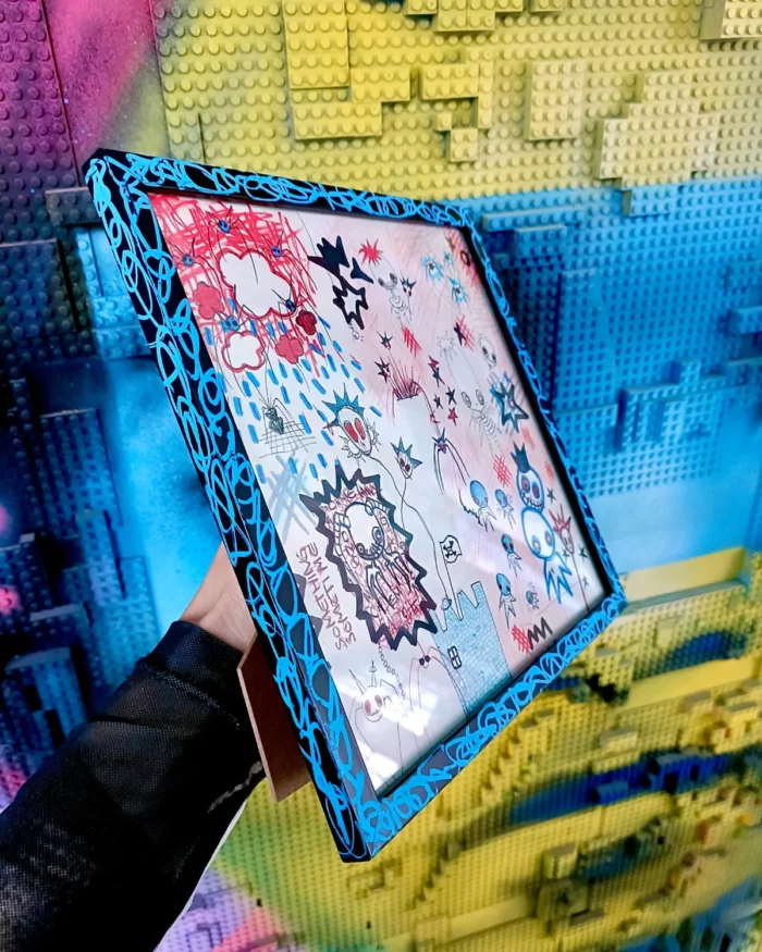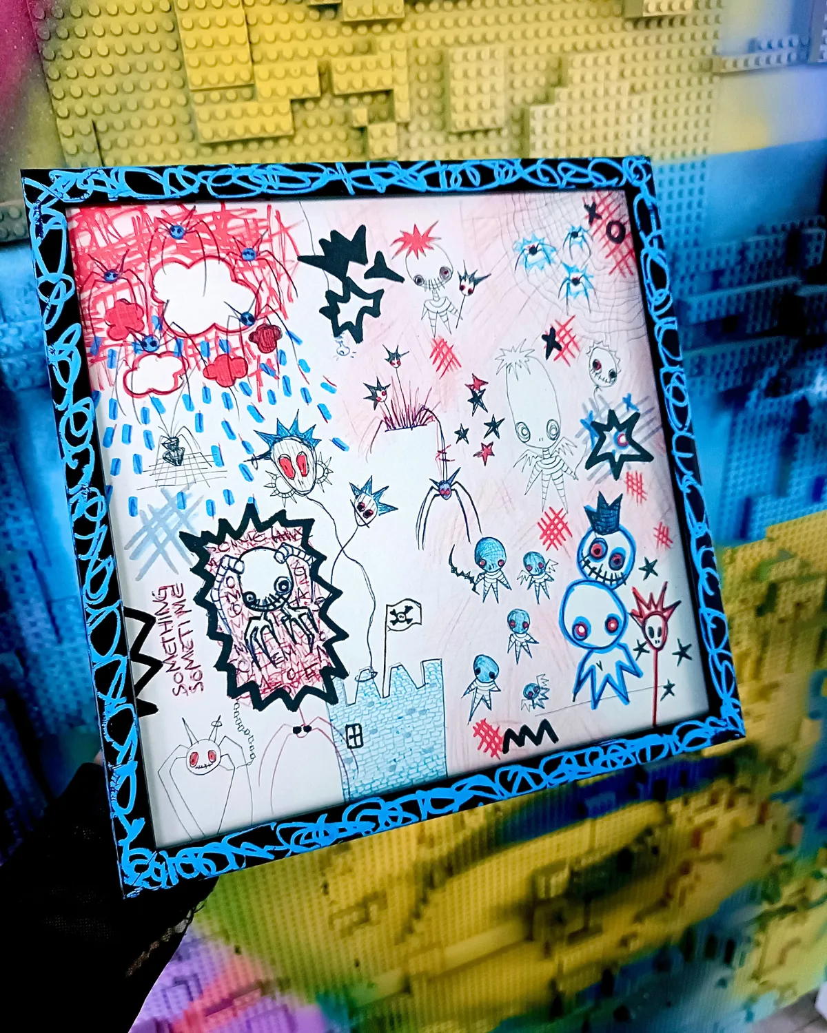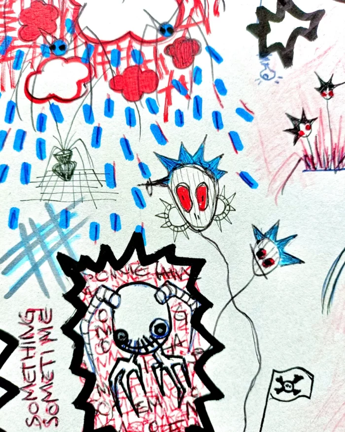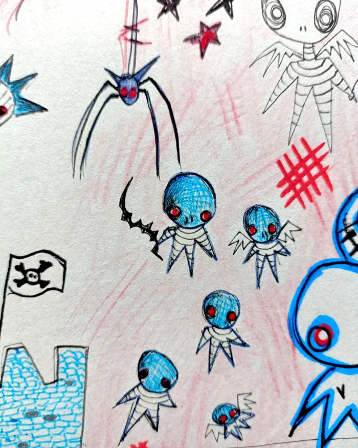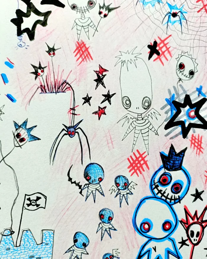 Ce dessin est un ensemble d’illustrations de style « doodle » ou « cartoon » avec une esthétique macabre ou étrange, représentant des personnages squelettiques, des monstres et des symboles divers, le tout encadré d’un motif bleu et noir.