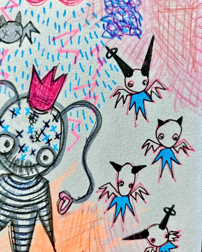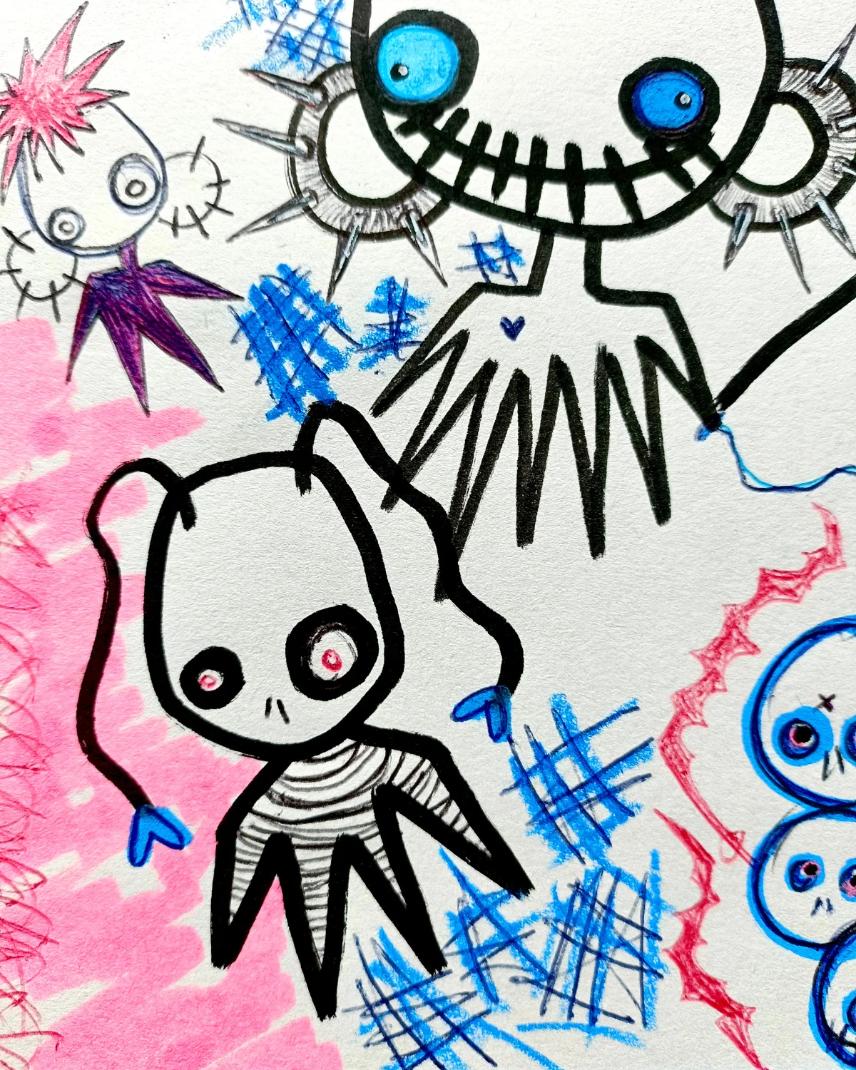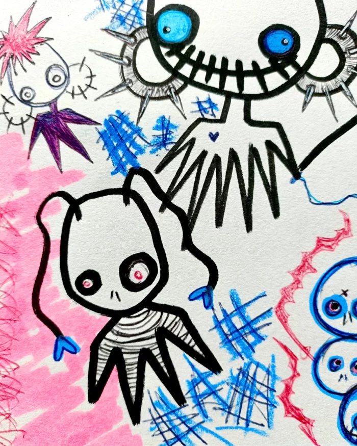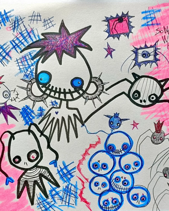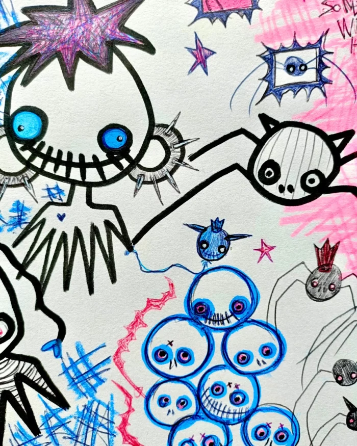 Ce dessin présente une collection de personnages de style « cartoon » avec une touche sombre ou effrayante, comprenant des têtes de mort, des créatures arachnoïdes et des figures aux grands yeux, le tout sur un fond rose et bleu, encadré d’un motif abstrait.
