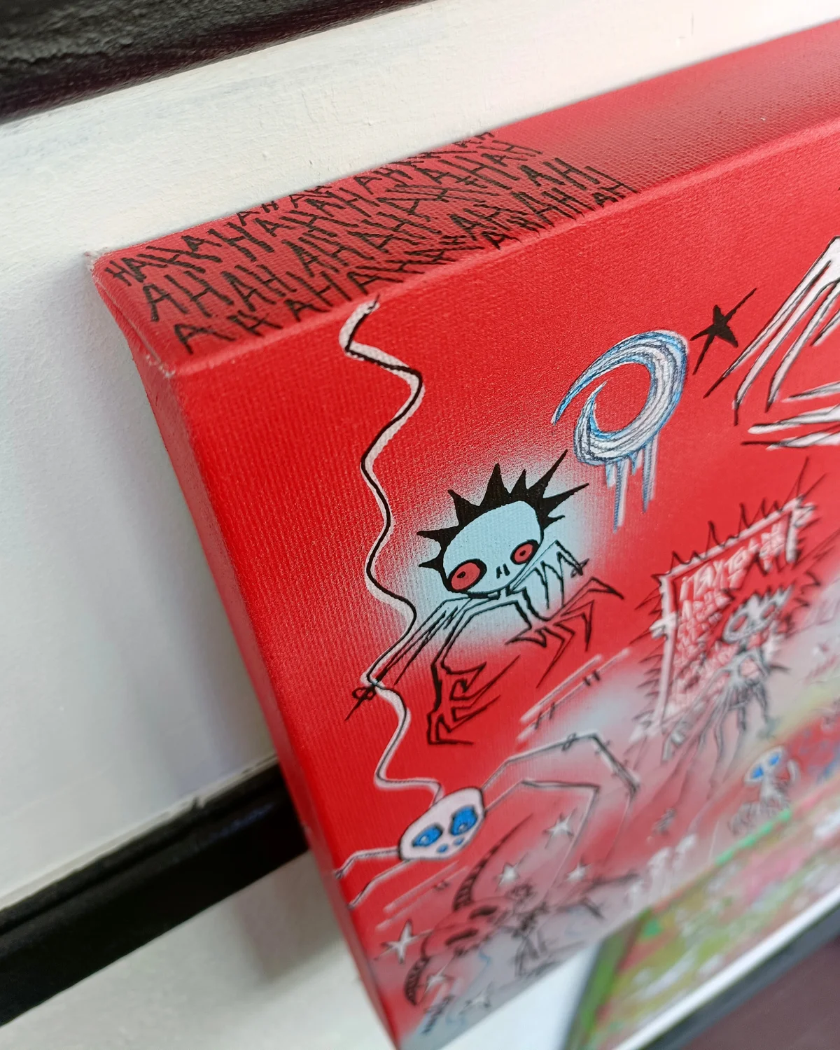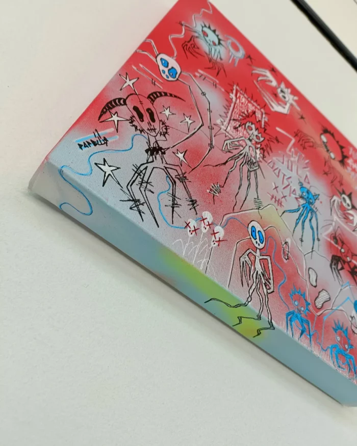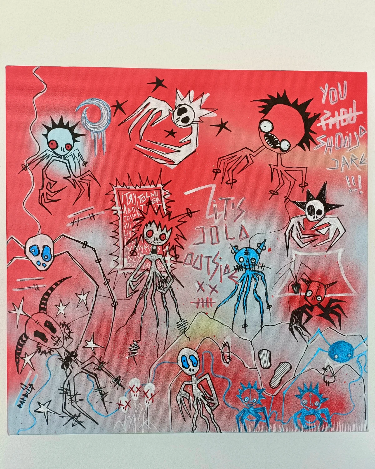 Sur un fond rouge dégradé vers le bleu pastel en bas. On y retrouve des personnages aux allures grotesques et fantastiques dessinés en noir, blanc, bleu et rouge vif. L’ensemble évoque une scène urbaine, entre graffiti et art brut avec des écritures ajoutant une dimension émotionnelle expressive.