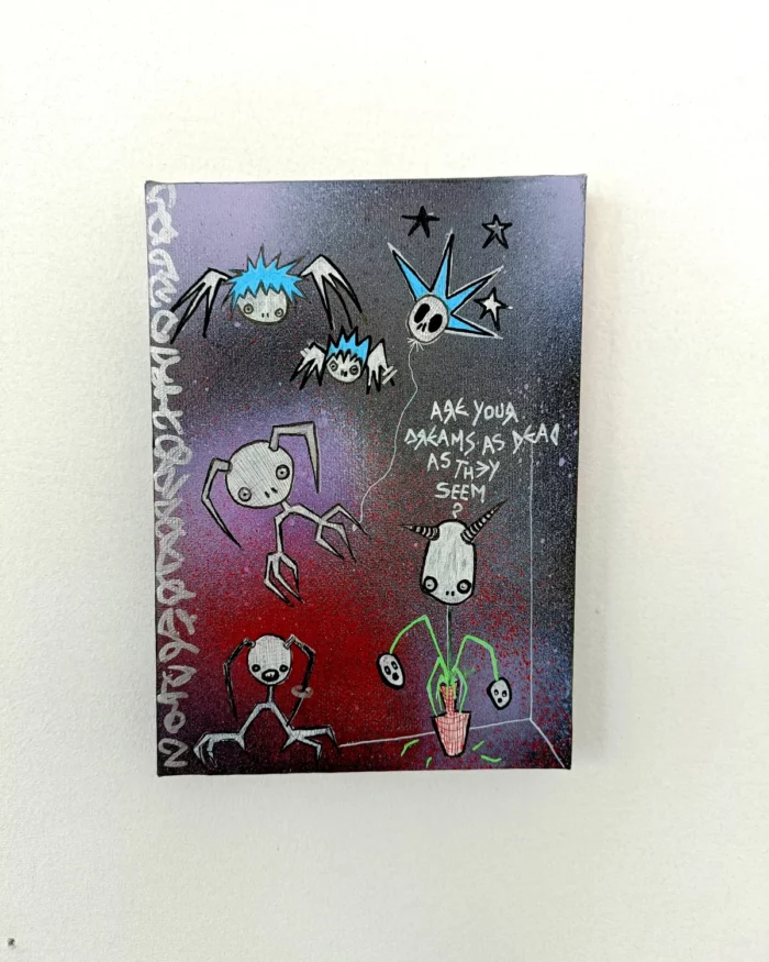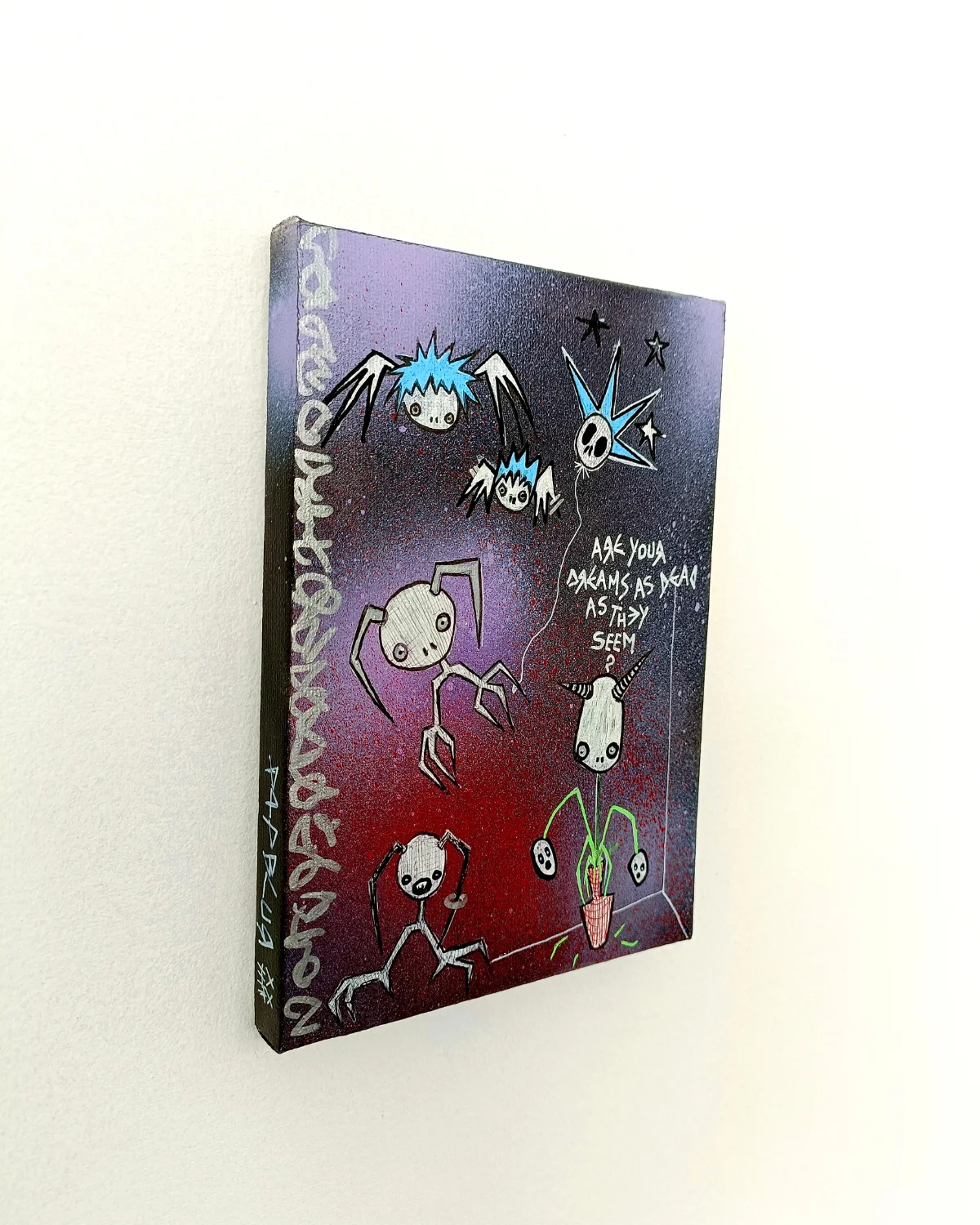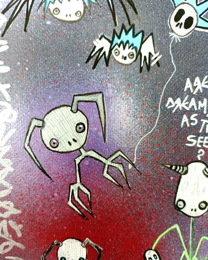 Ce tableau sur un fond dégradé de rouge, noir et violet présente une scène à l’esthétique sombre et fantaisiste, réalisée dans un style street art ou pop surréaliste. On y voit plusieurs créatures étranges aux grands yeux ronds et aux membres exagérés.