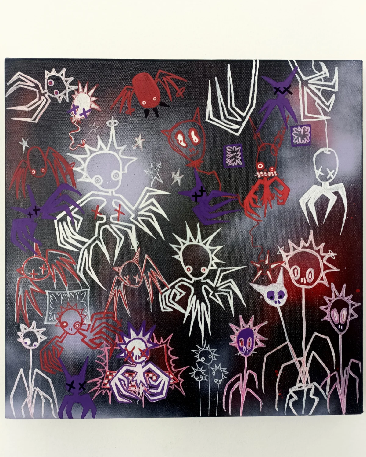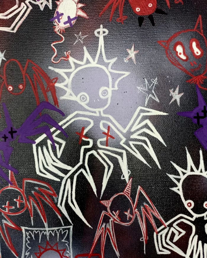 Ce tableau présente une scène dense et expressive sur fond galactique. Il est rempli de créatures hybrides et fantastiques, souvent à l’apparence inquiétante mais aussi enfantine. Leurs membres sont anguleux, presque arachnéens.