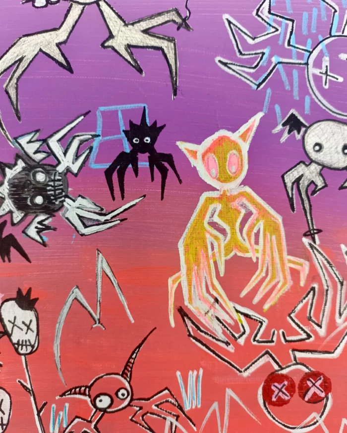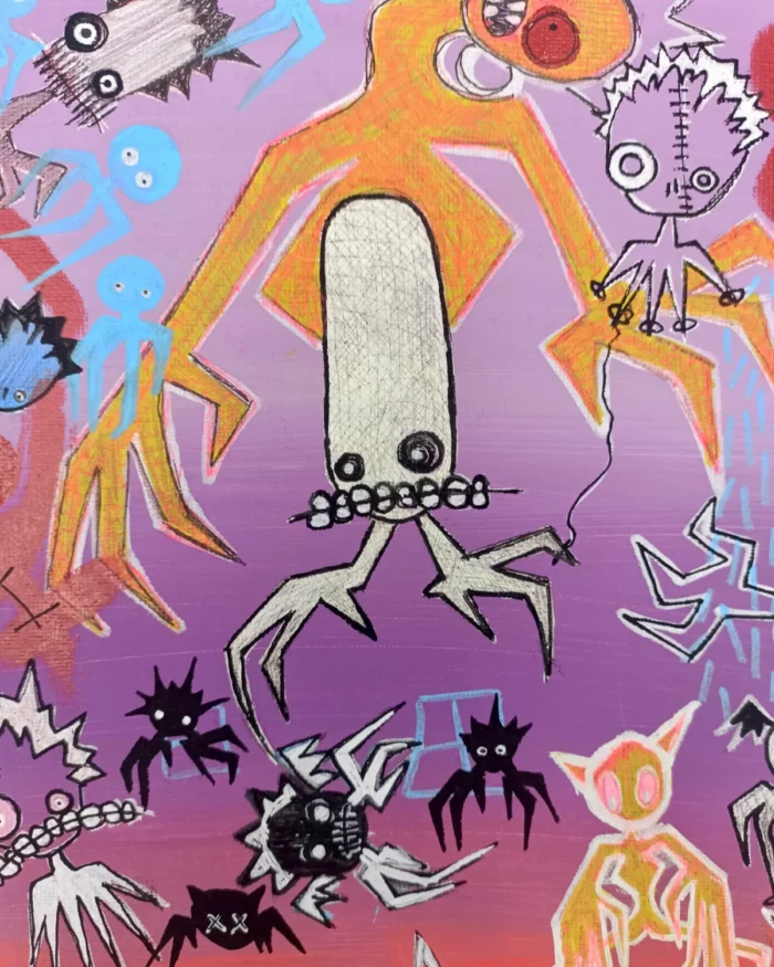 Sur un fond dégradé, allant du violet (ciel crépusculaire) au rouge (le feu), il fait ressortir les personnages du premier plan, des créatures anthropomorphes. Certaines ont des bras allongés, des bouches pleines de dents, des yeux ronds. Cela peut évoquer des peluches cousues ou rafistolées, des symboles associés à l’innocence perdue.