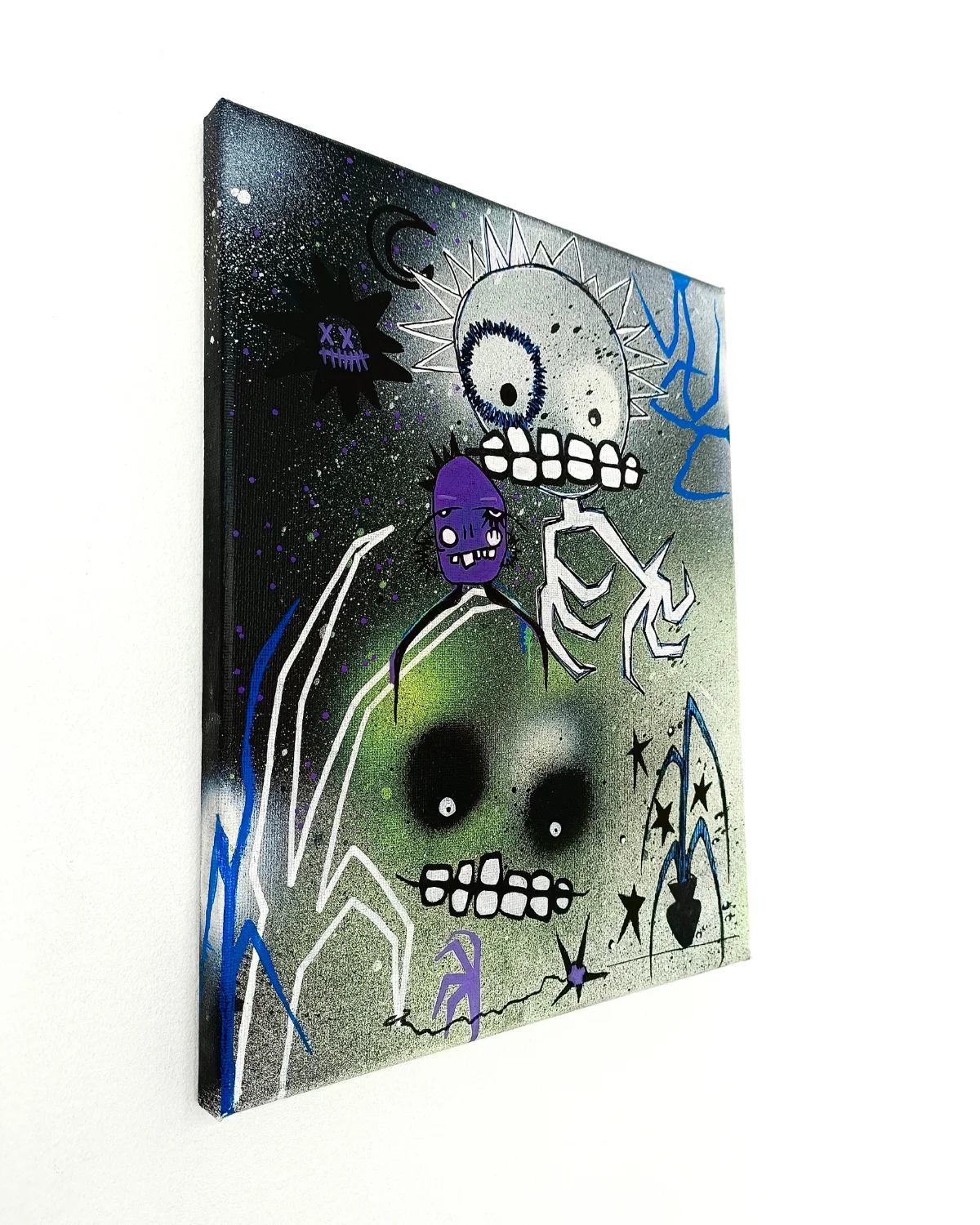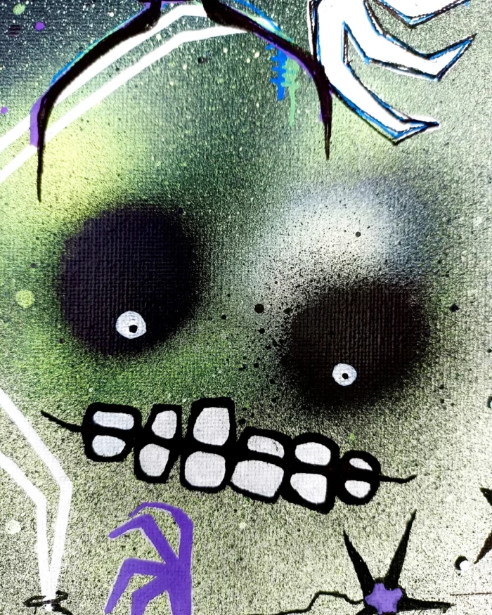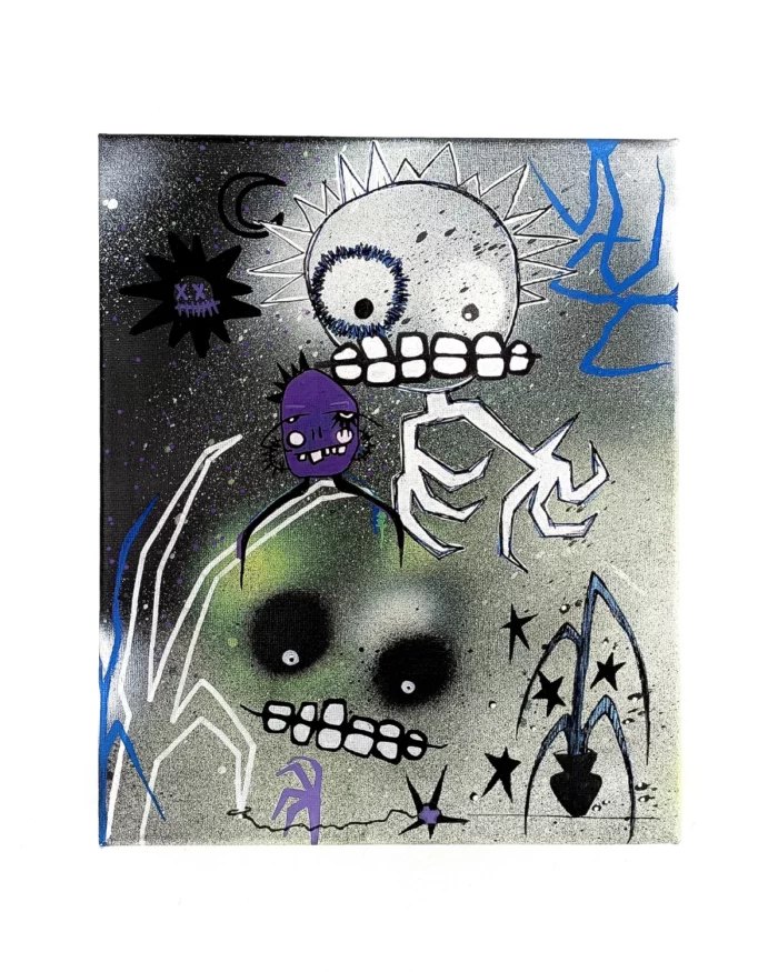 Ce tableau présente une composition sombre, typique de l’art urbain ou « street art » sur un fond dégradé de noir et de gris galactique. On y voit des figures stylisés et abstraites, aux allures de créatures ou de monstres. L’ensemble dégage une atmosphère ludique et macabre.