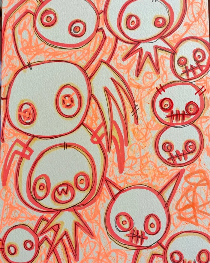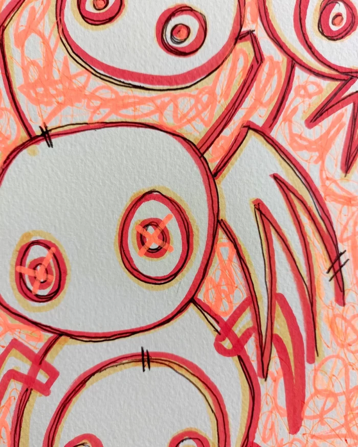 Ce dessin sur papier épais représente une série de créatures expressives aux allures de petits monstres kawaï, certains représentent des araignées, il y a toujours ces yeux omniprésents créant une tension ou une connexion directe vers le spectateur. Les couleurs accentuent l’aspect pop et expressif. Le cadre est orange de base.