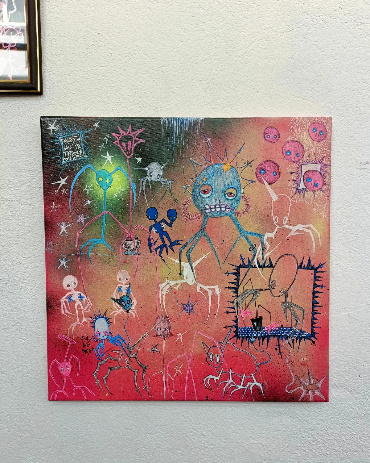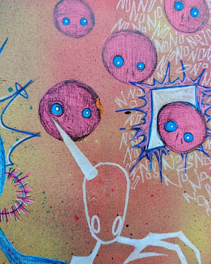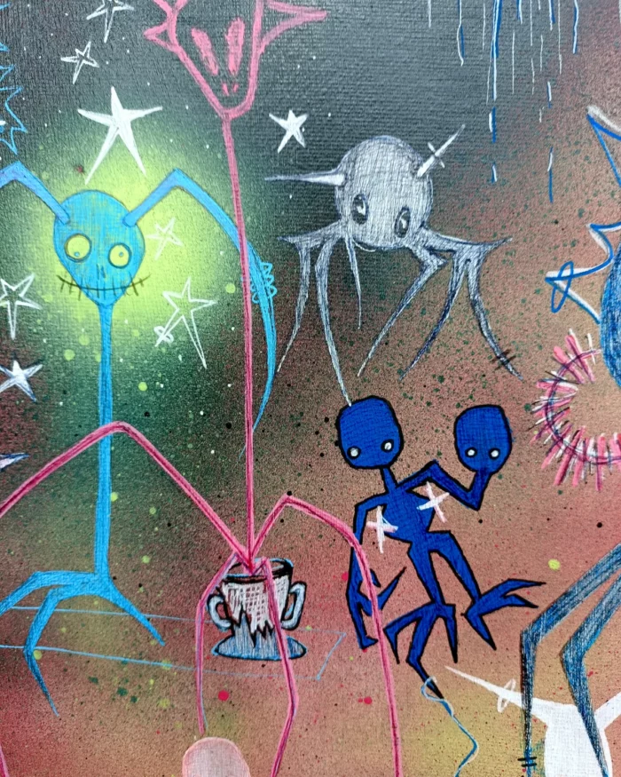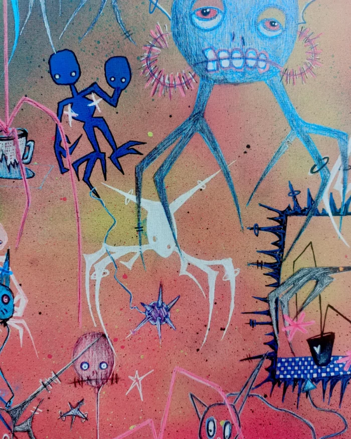 Sur un fond dégradé d’orange et de rose, avec des touches de noir pour les détails et les projections de peinture. Ce tableau présente des créatures stylisées bleues, roses et blanches arborent des expressions variées.